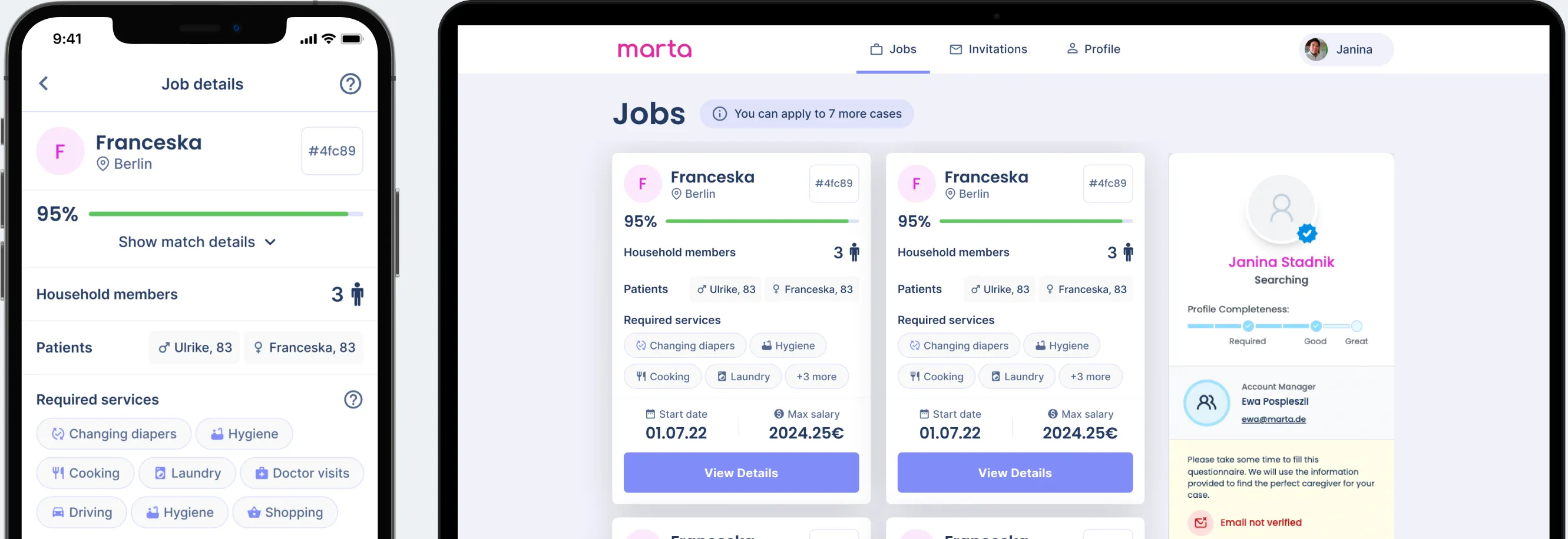 Sehen Sie unten wie Sie Schritt-für-Schritt eine Betreuungskraft auf der marta Plattform finden. Vom Profil erstellen bis zum Vertrag unterschreiben.